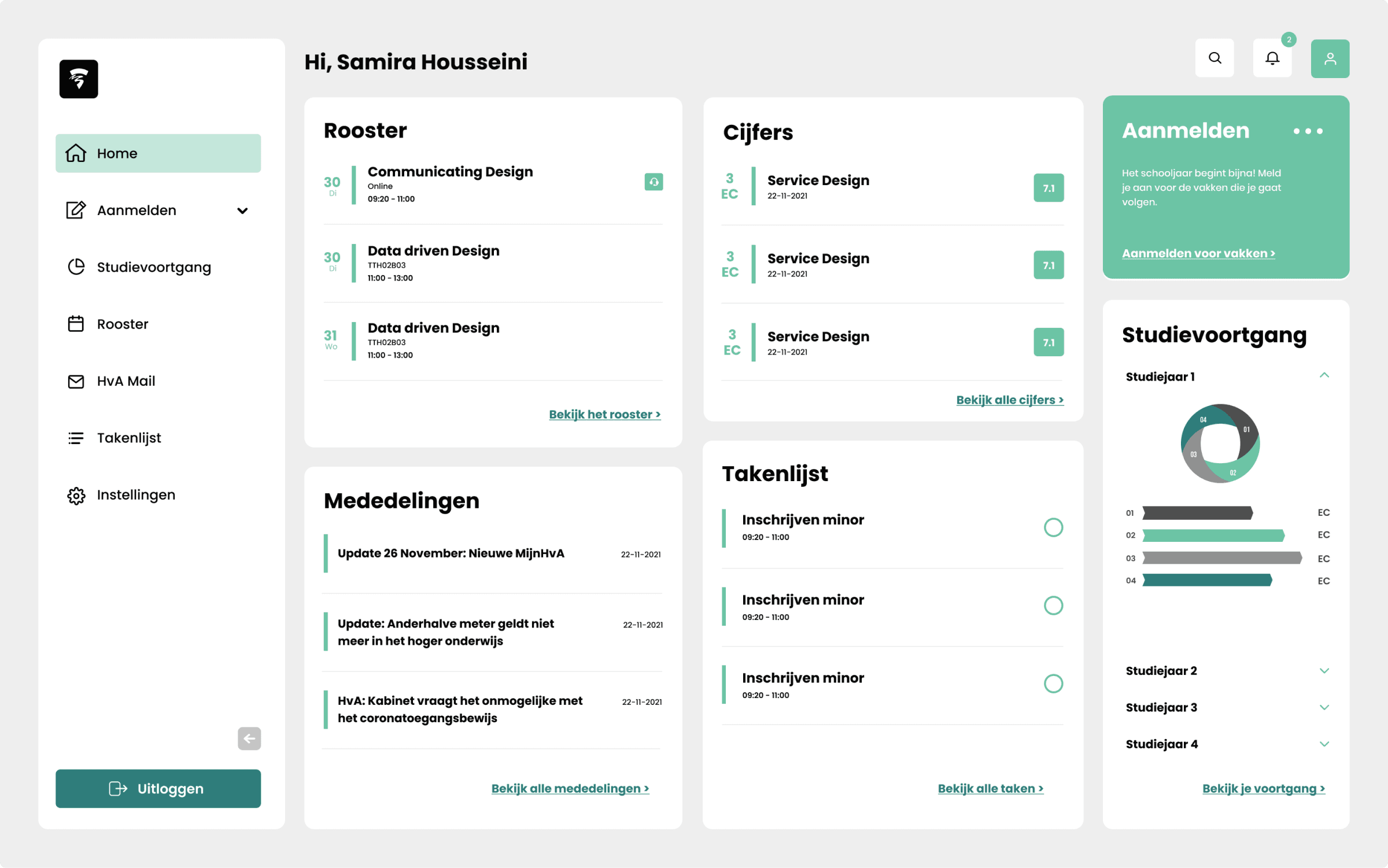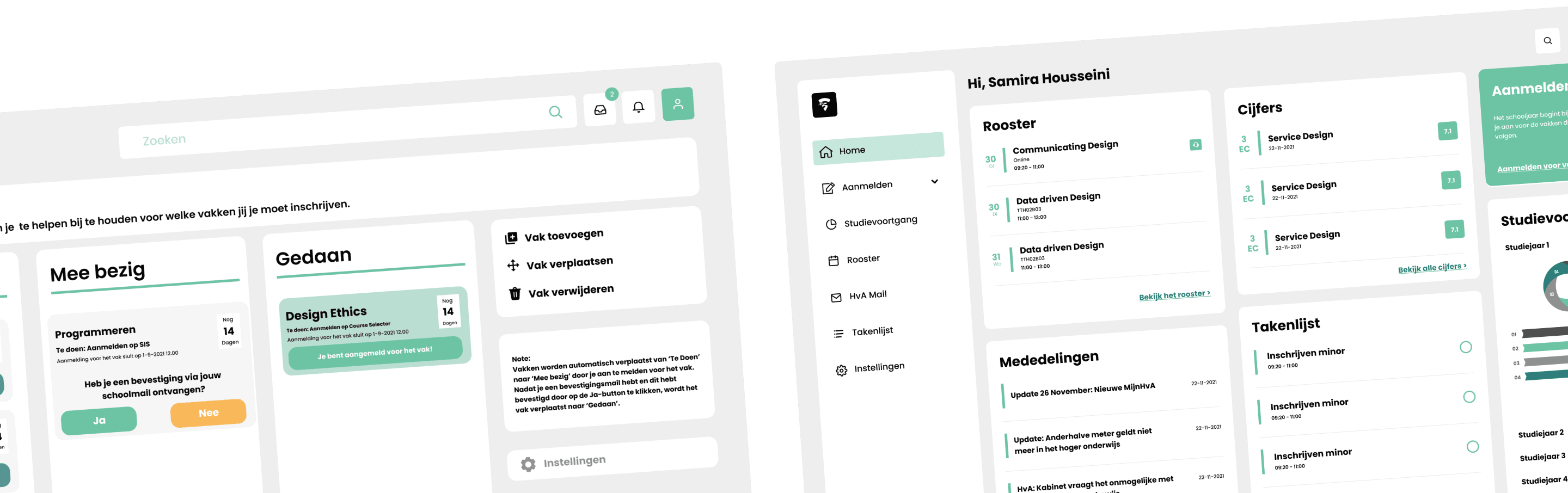 Alle studiebenodigdheden op één plek: een vernieuwd studieplatform dat verschillende functies samenbrengt in één systeem. Studenten kunnen hun studiejaren overzichtelijk bekijken, met een lijst van behaalde en niet-behaalde vakken en de bijbehorende resultaten. Ook kunnen ze zich eenvoudig aanmelden voor vakken en herkansingen, en belangrijke mededelingen ontvangen. Daarnaast biedt het portaal handige functies zoals een persoonlijk rooster en een takenlijst. Het doel is om studenten een gebruiksvriendelijk hulpmiddel te bieden waarmee ze meer grip krijgen op hun studie.