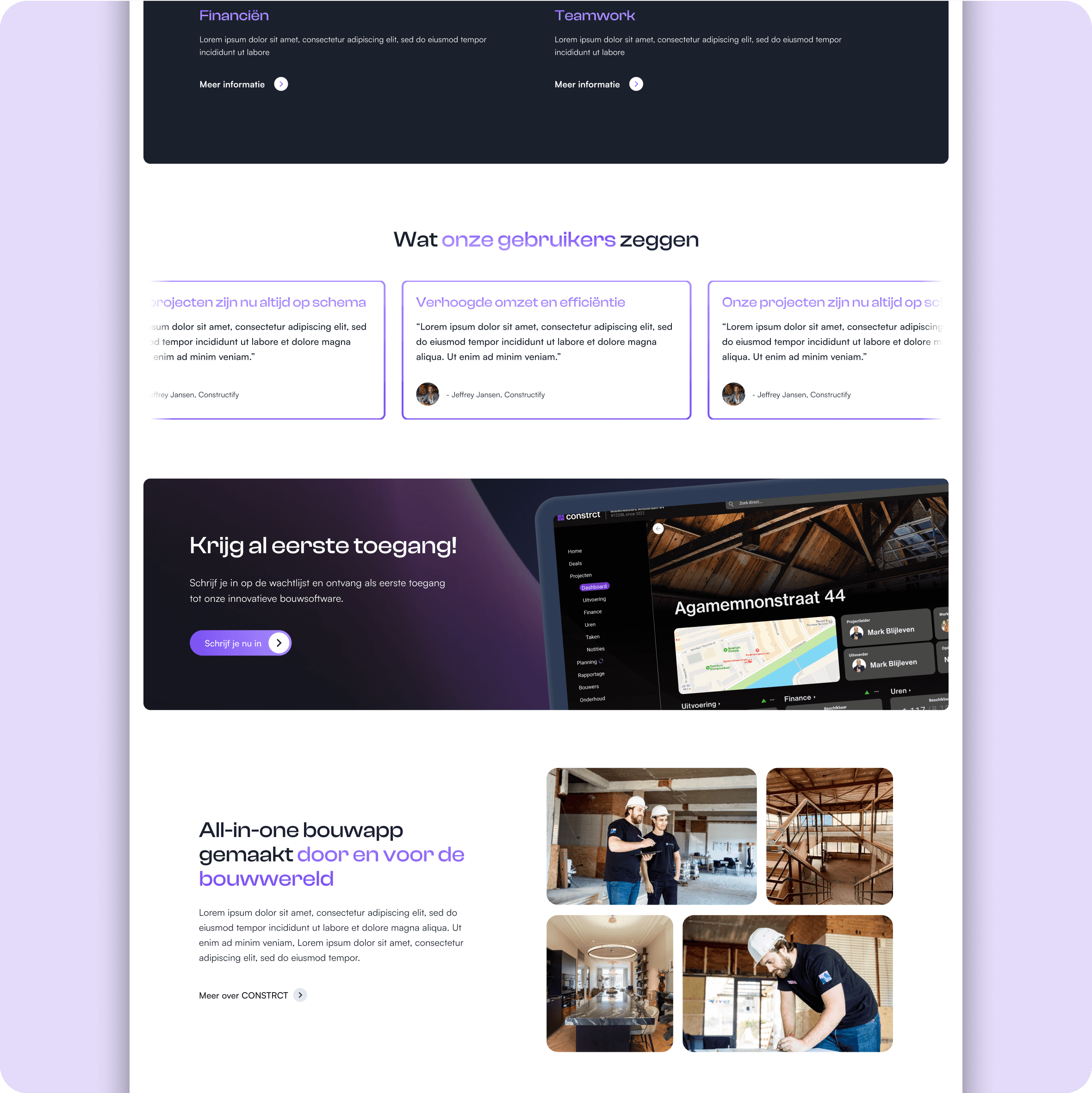 De nieuwe website maakt duidelijk waarom Constrct onmisbaar is voor bouwbedrijven, duidelijke uitleg over de functionaliteiten, strakke visuals die de app in actie tonen en een overzichtelijke structuur die de bezoeker moeiteloos door de informatie leidt.