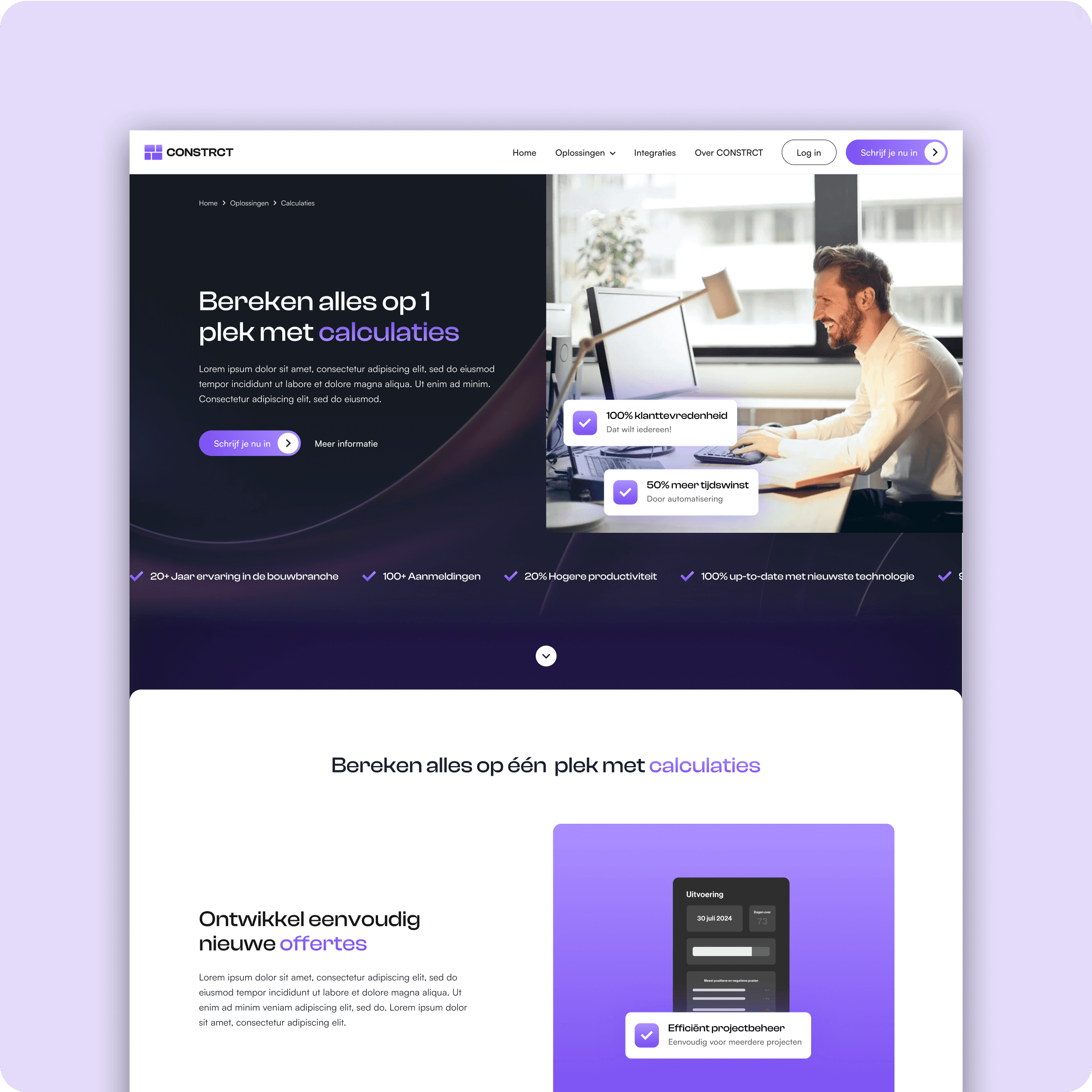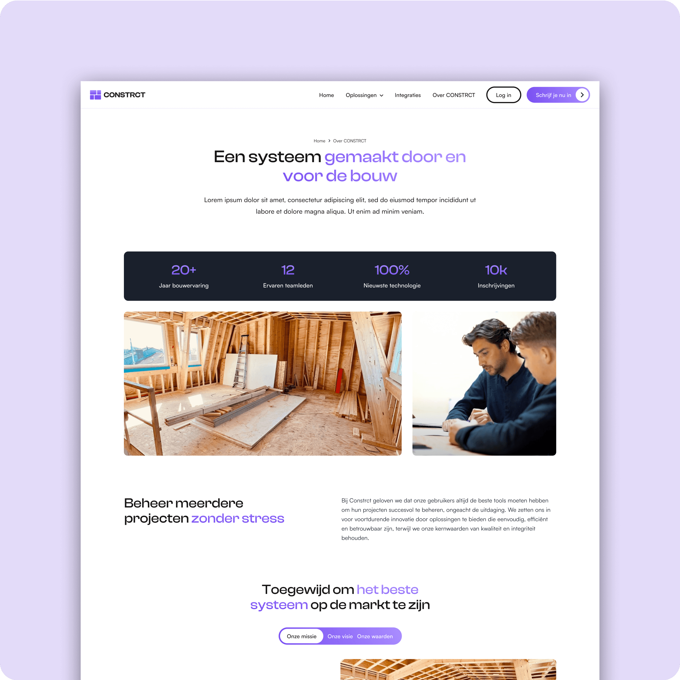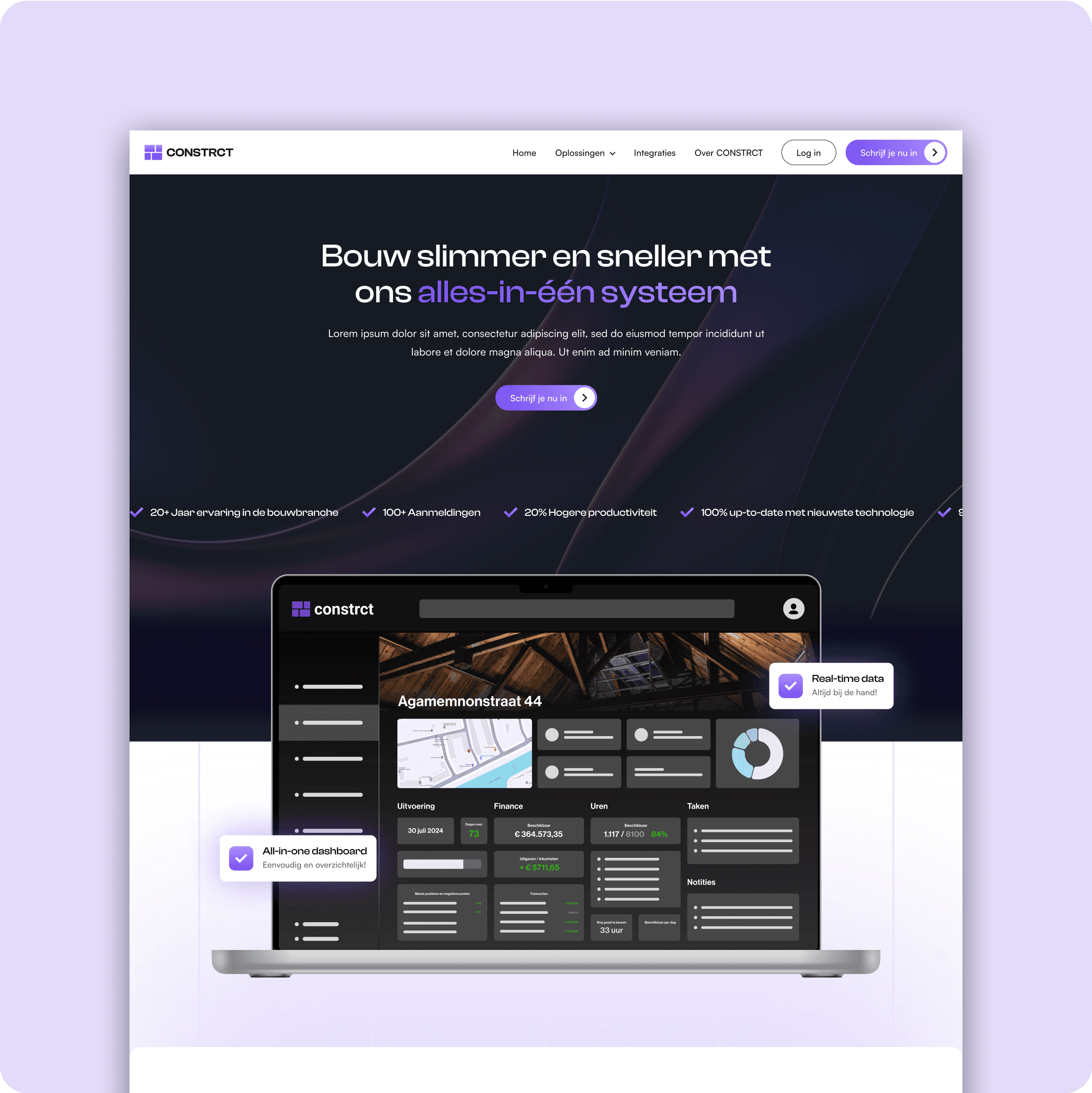Constrct helpt bedrijven in de bouwsector met een slimme bouwapp voor projectmanagement, klantbeheer en personeelsplanning. Wat Constrct uniek maakt, is dat de app is ontwikkeld door en voor mensen uit de bouw, waardoor deze perfect aansluit op de praktijk. De uitdaging lag in het ontwikkelen van een website die duidelijk uitlegt wat de app kan en hoe bouwbedrijven hiermee efficiënter kunnen werken.
